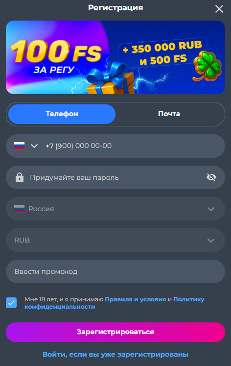 Процесс регистрации в Champion Casino максимально упрощен и занимает не больше двух минут. Создать аккаунт можно одним из четырех способов.